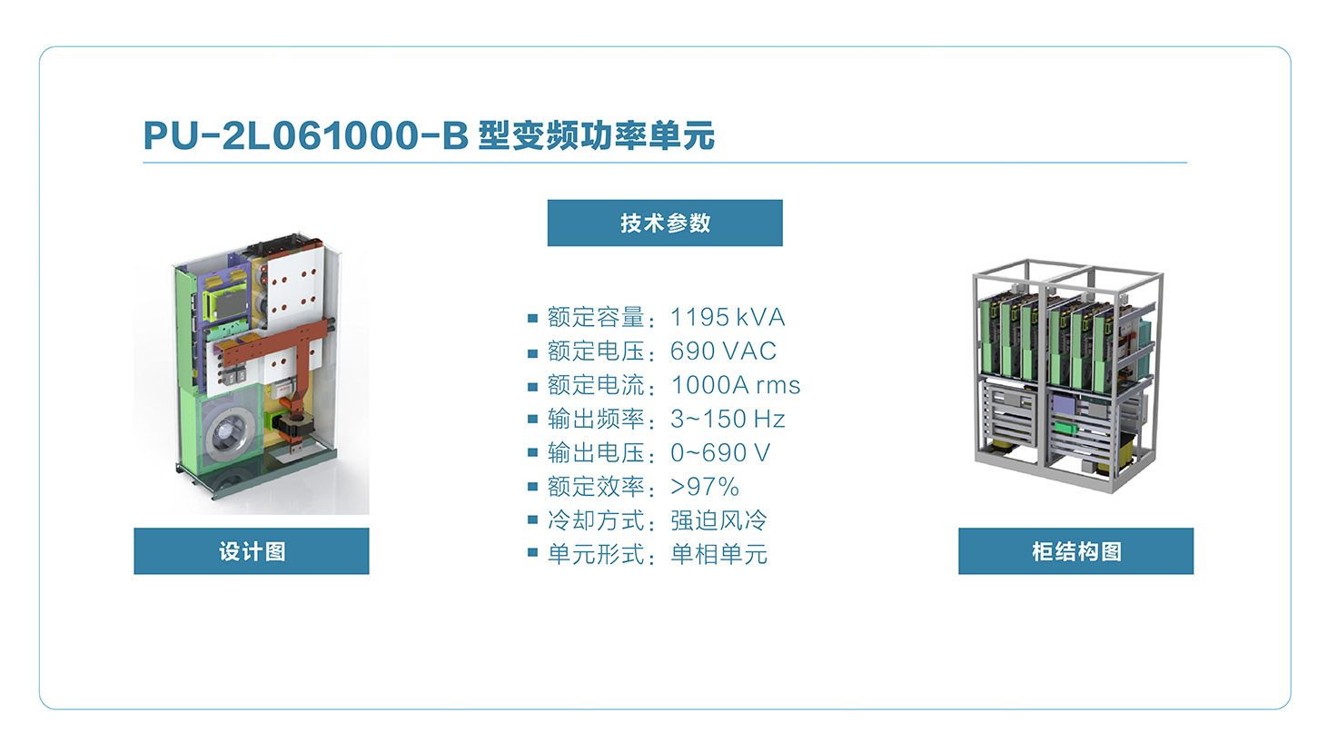 额定容量:1195 kVA 额定电压:690 VAC 额定电流:1000A rms 输出频率:3~150 Hz 输出电压:0~690 V 额定效率:>97% 冷却方式:强迫风冷 单元形式:单相单元